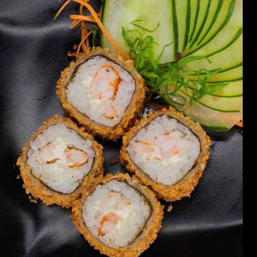 Nori, arroz, cream cheese e camarão frito na farinha panko.
