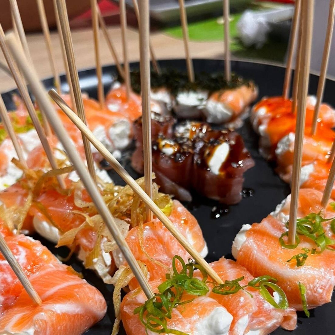 Tiras de salmão, molho especial, gergelim e cebolinha.