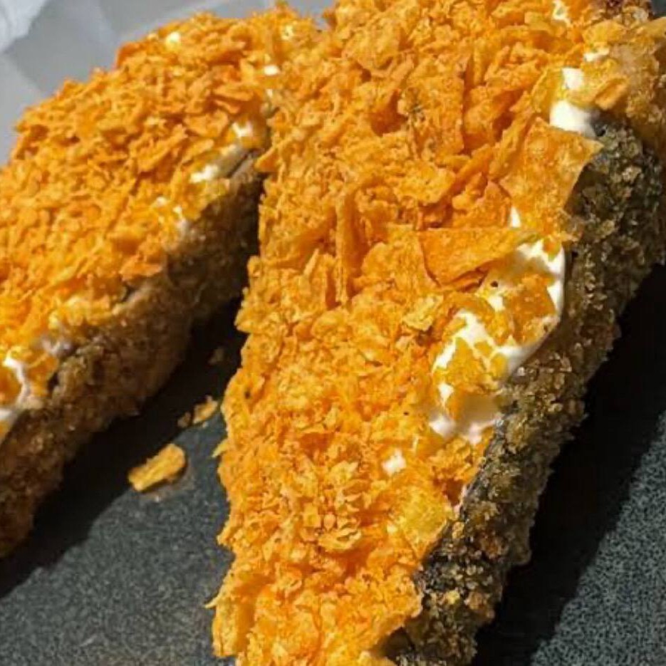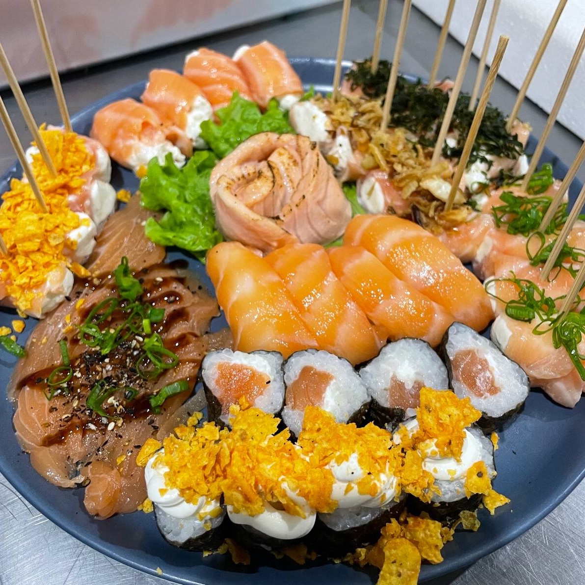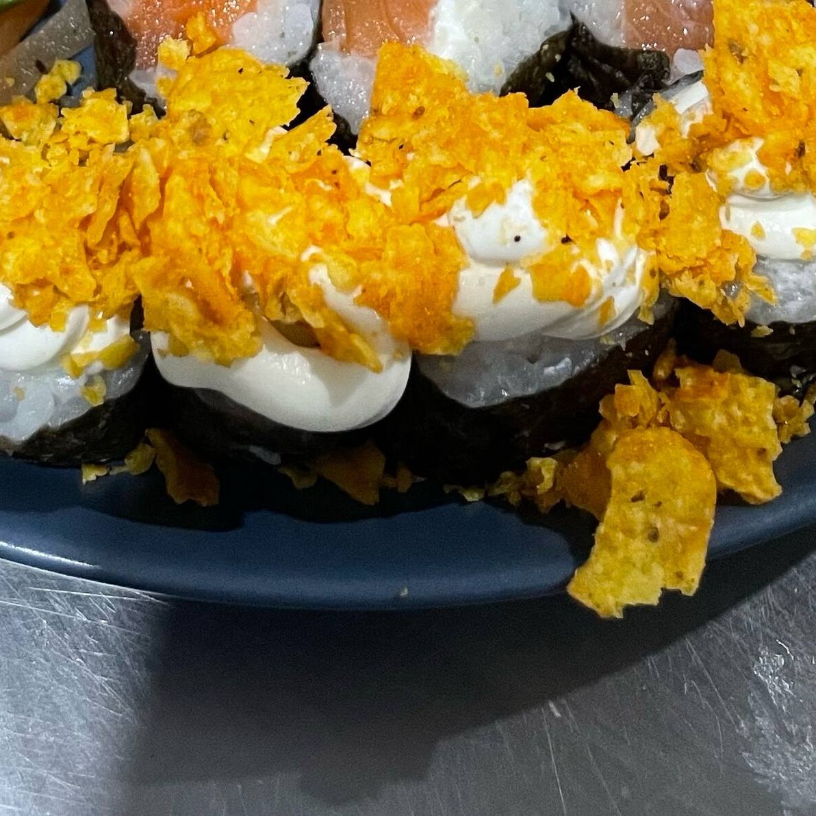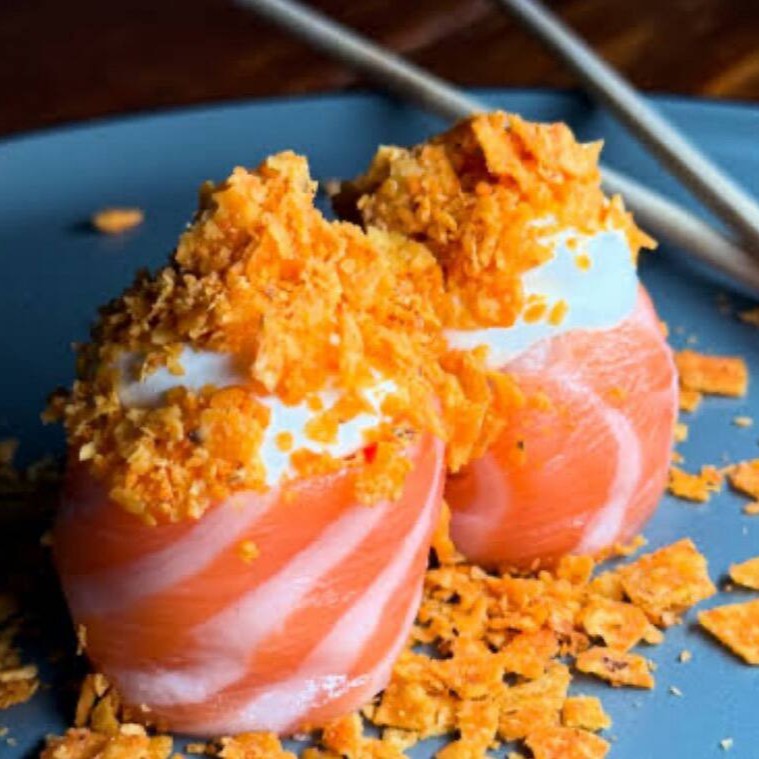 Nori, arroz , salmão, cream cheese e Doritos.