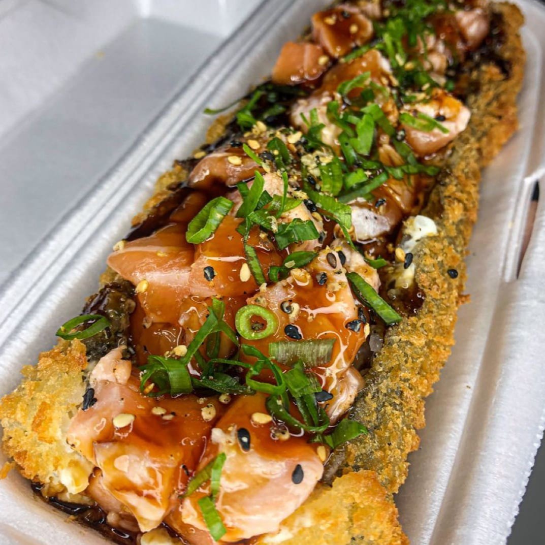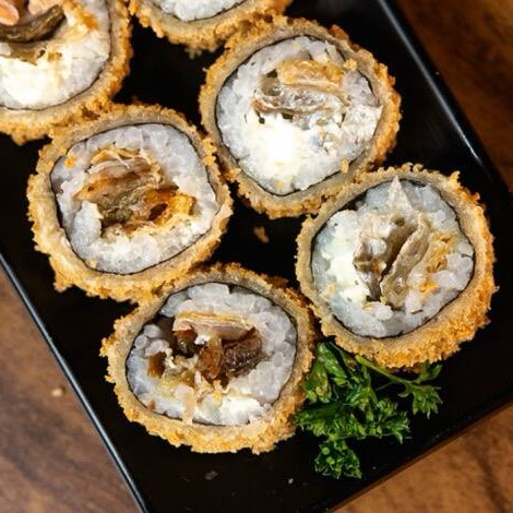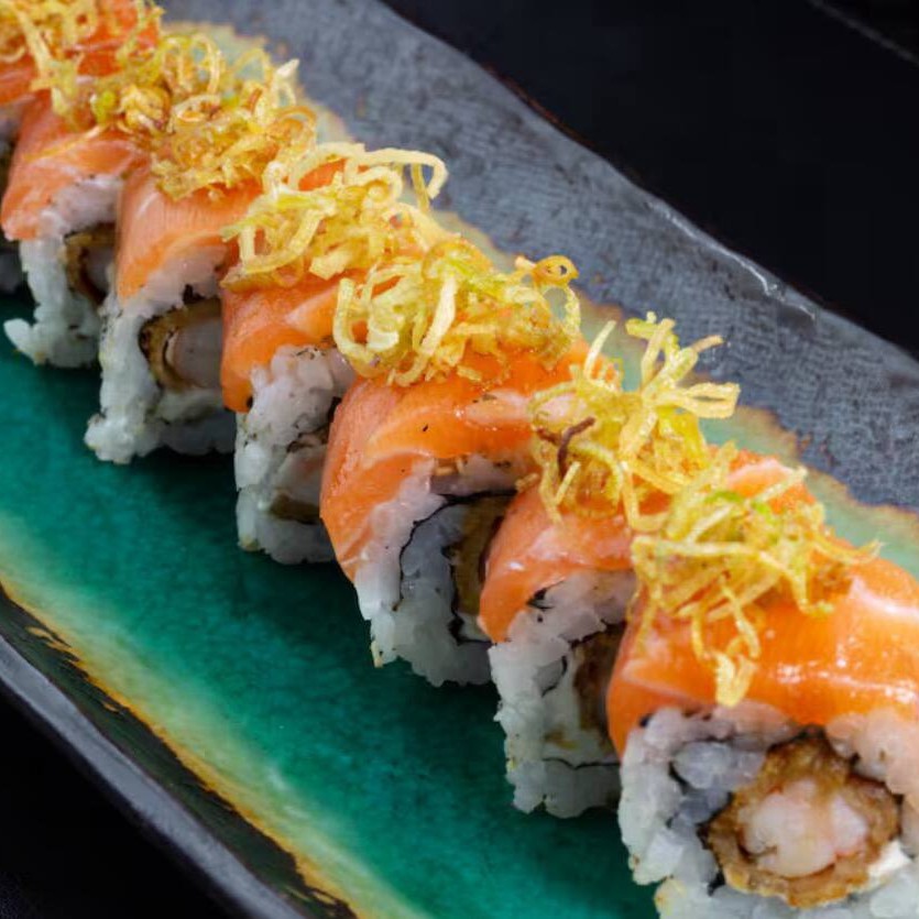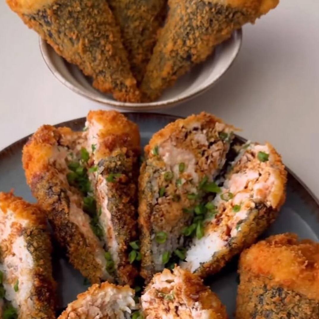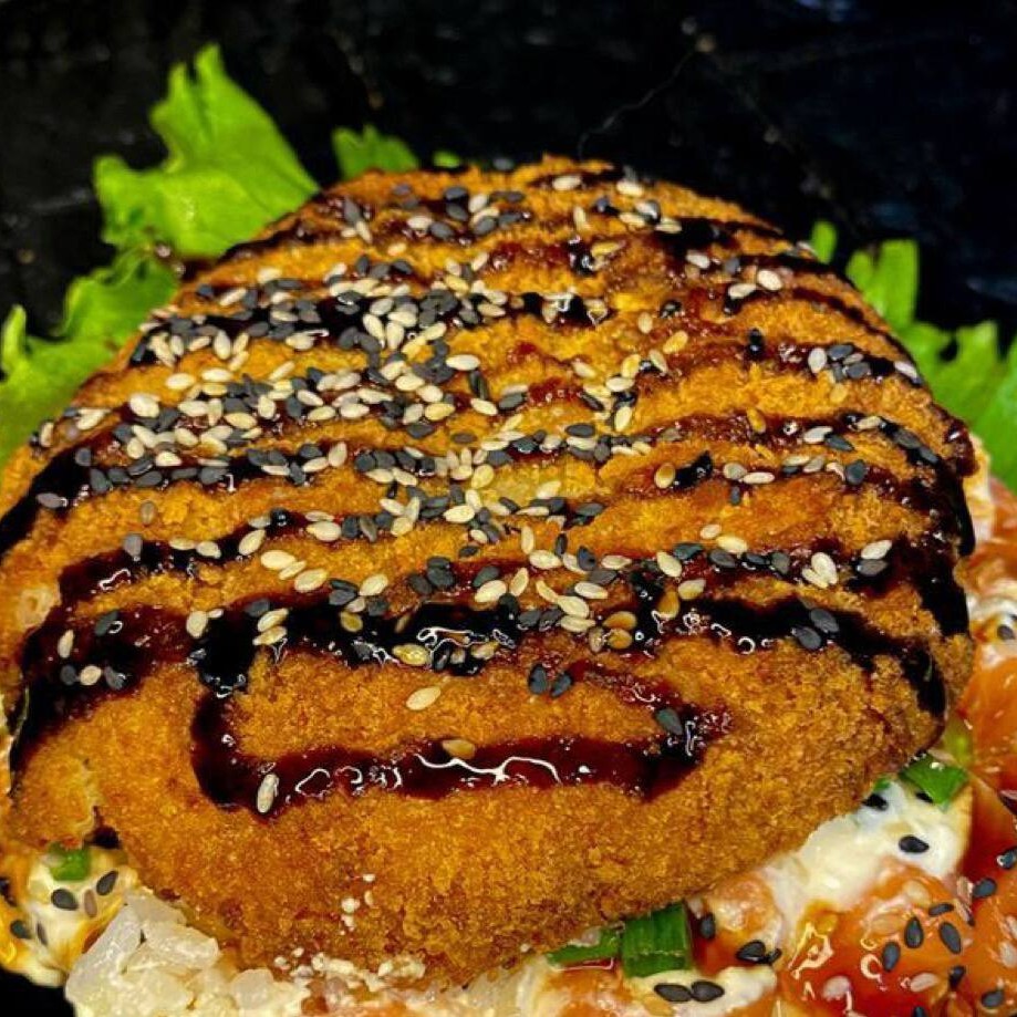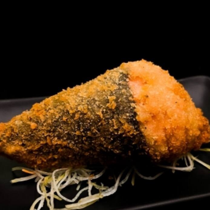 Arroz e alga emapanado na farinha panko e frito, recheado com salmão (Cru ou Maçaricado) com cream cheese, cebolinha e gergelim
