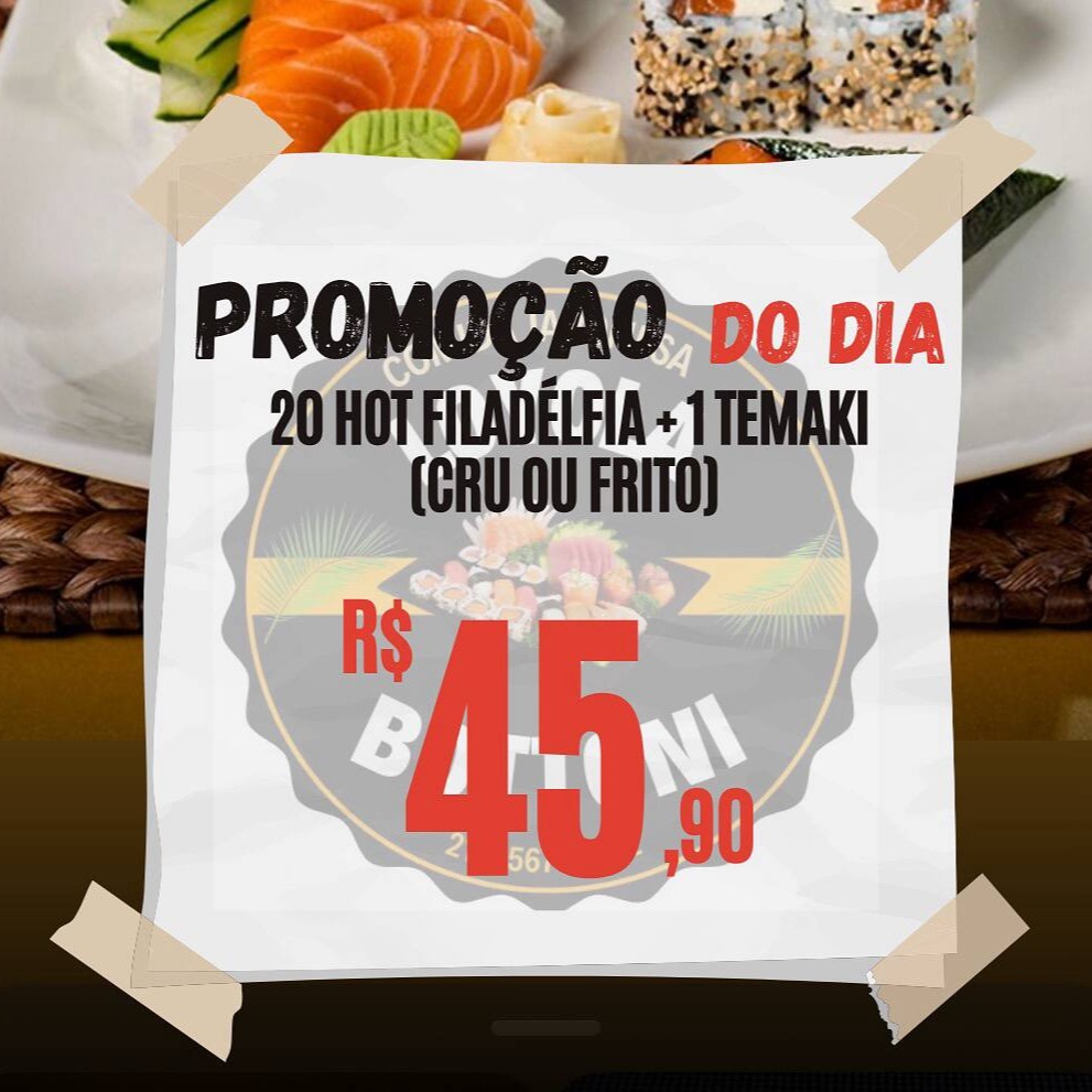20 hot filadélfia, 10 hot skin, 5 uramaki tuna, 5 makimono filadélfia doritos, 5 filadélfia couve crispy, 2 bolinhos de salmão, 4 joys peixe branco, 4 harumaki doce de leite, 3 niguiri salmão, 2 niguiri kani