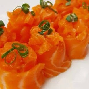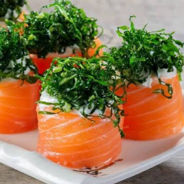 Fatia de salmão enrolado com cream cheese e alho poró. (4 unidades)