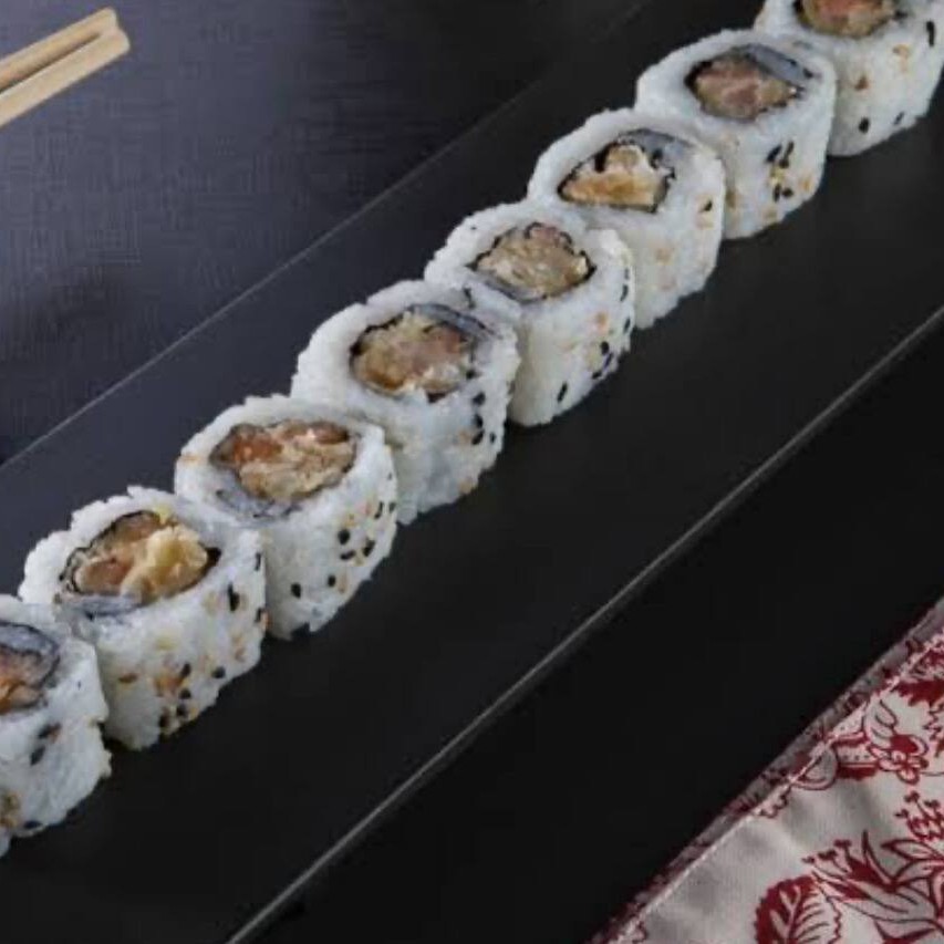 Nori, arroz, cream cheese, cebolinha , salmão, frito na farinha panko