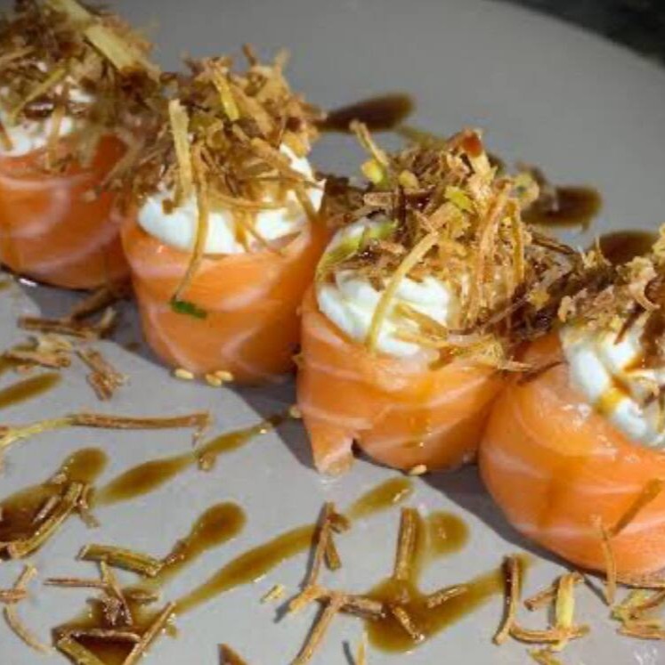 Fatia de salmão enrolado com cream cheese com couve crispy (4 unidades)