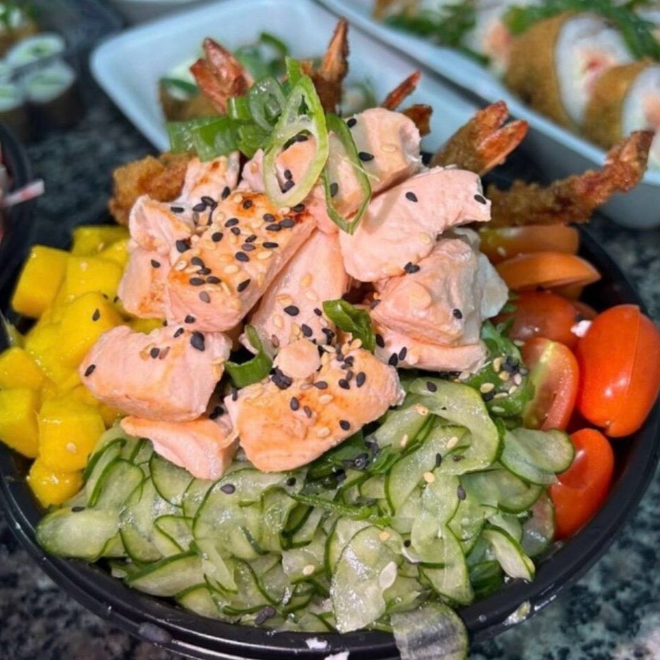 (600g) A base do seu poke é o arroz, escolha seus ingredientes, finalizamos com gergelim e cebolinha.