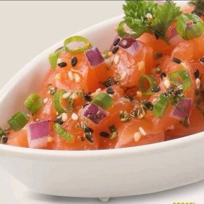 Cubos de salmão ao molho especial, cebolinha e gergelim