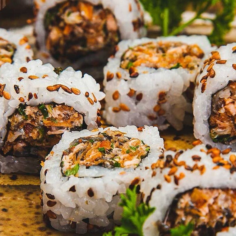 Arroz por fora, gergelim, Nori e salmão.