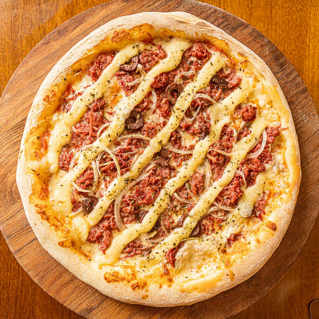 Ingredientes: Molho Pelatti italiano, muçarela, gorgonzola, Catupiry Original e orégano.