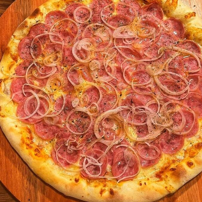 Pizza Calabresa: Molho pomodoro, muçarela, calabresa, cebola e orégano.