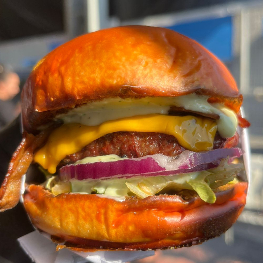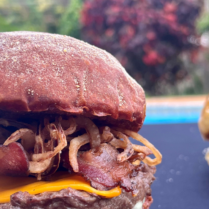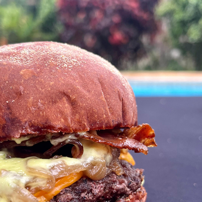 Blend 150g, Cheddar Fatiado, Bacon, Cebola Caramelizada e Maionese da Casa no Pão Australiano