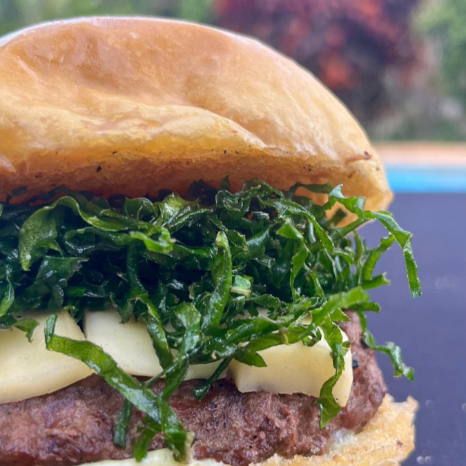 Blend 150g, Queijo Coalho, Couve Crispy e Geleia de Pimenta no Pão Brioche
