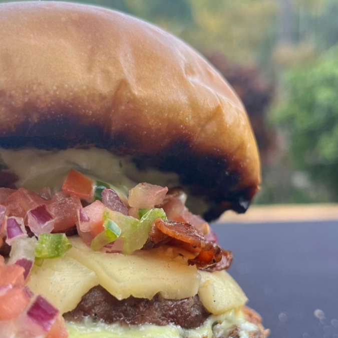 Blend de 150 g , Queijo Coalho , Bacon, Vinagrete e Maionese da Casa no Pão Brioche.