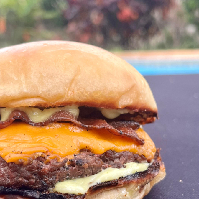 Blend 150g, Cheddar Fatiado, Bacon e Maionese da Casa no Pão Brioche.