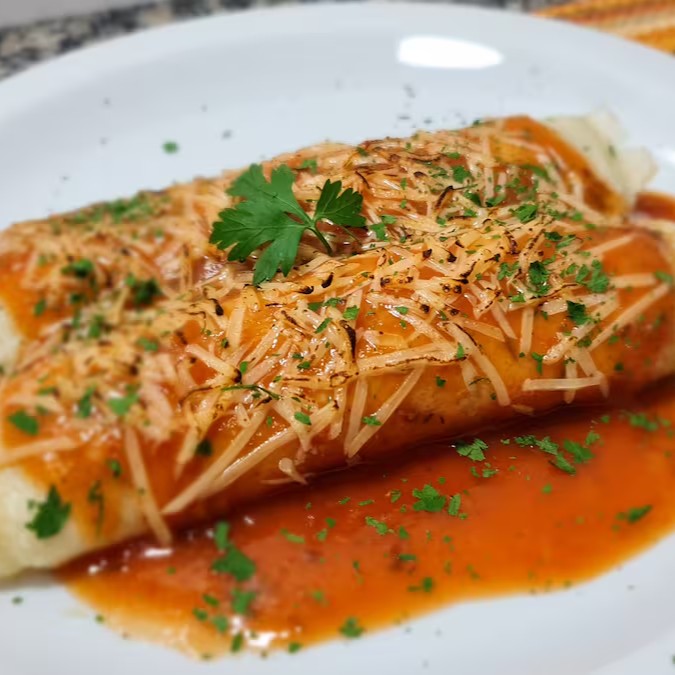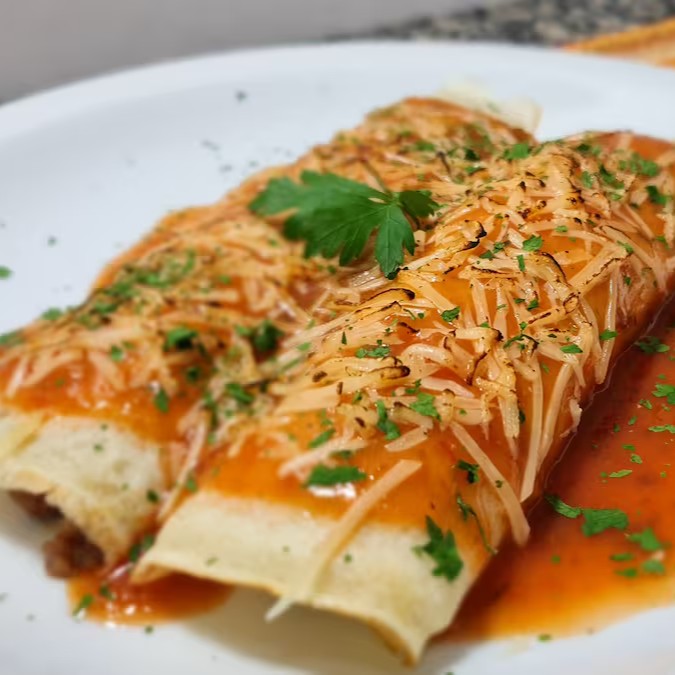 Panqueca com massa levíssima feita com recheio de Carne Moída, molho ao sugo e Parmesão ralado.