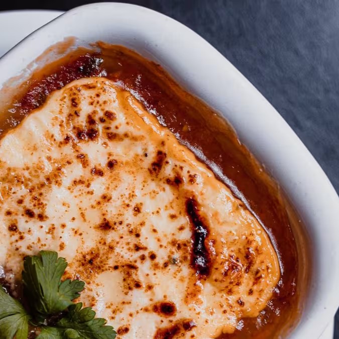Escondidinho de Carne Moída com base de massa de aipim, recheio de molho de carne moída e cobertura de creme de queijo com queijo gratinado.