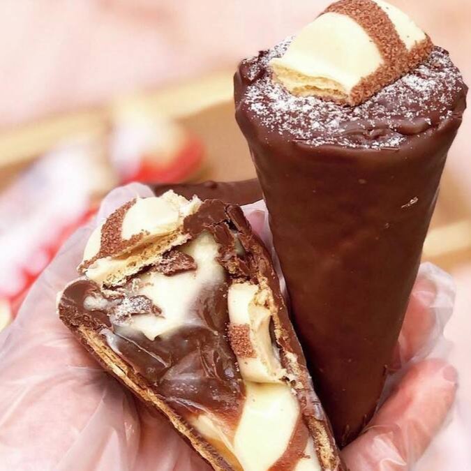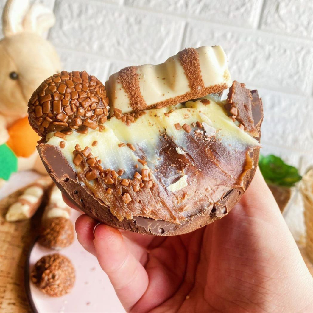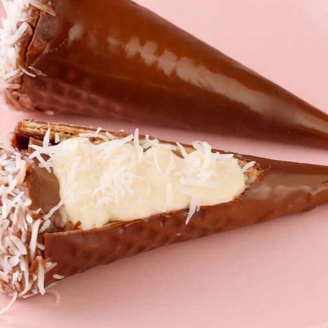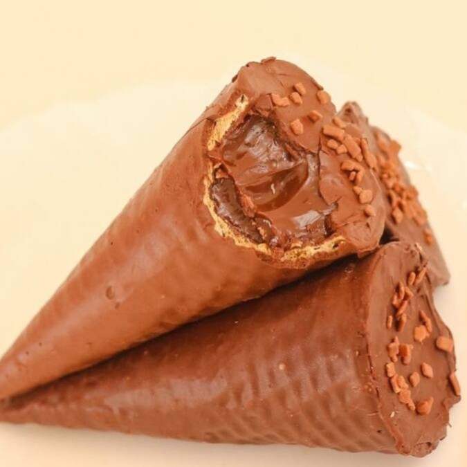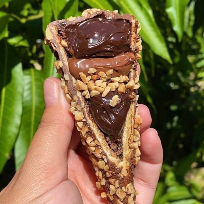 Casquinha Banhada com Chocolate Meio Amargo e Cravejada com Amendoim Triturado. Recheada com Brigadeiro 50% cacau, Amendoim e Nutella.