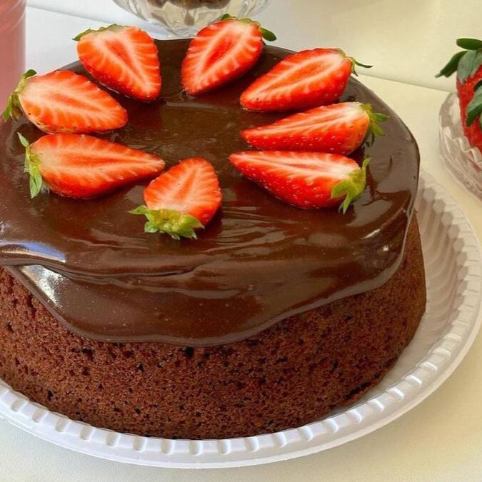 Massa de Chocolate molhadinha, com Brigadeiro 50% cacau e Morangos frescos.