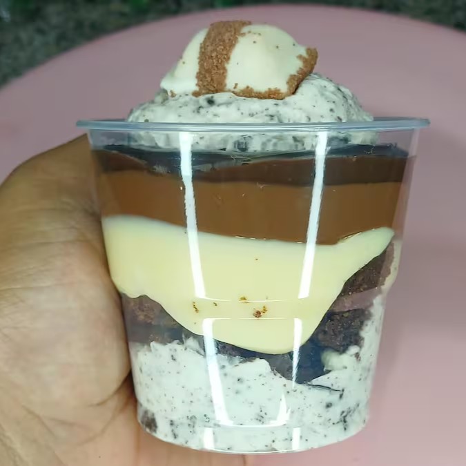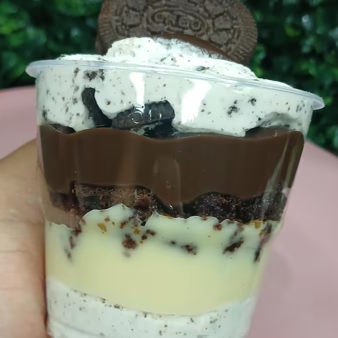 Mousse Oreo, Brigadeiro de Ninho, Brownie Picado, Brigadeiro 50% cacau, Biscoito Oreo picado e Finalizado com Mousse Oreo.210g