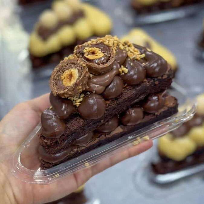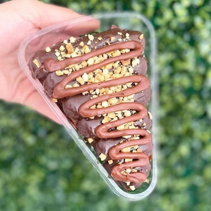 Fatia de Brownie, Brigadeiro 50% cacau, Nutella e Amendoim Triturado