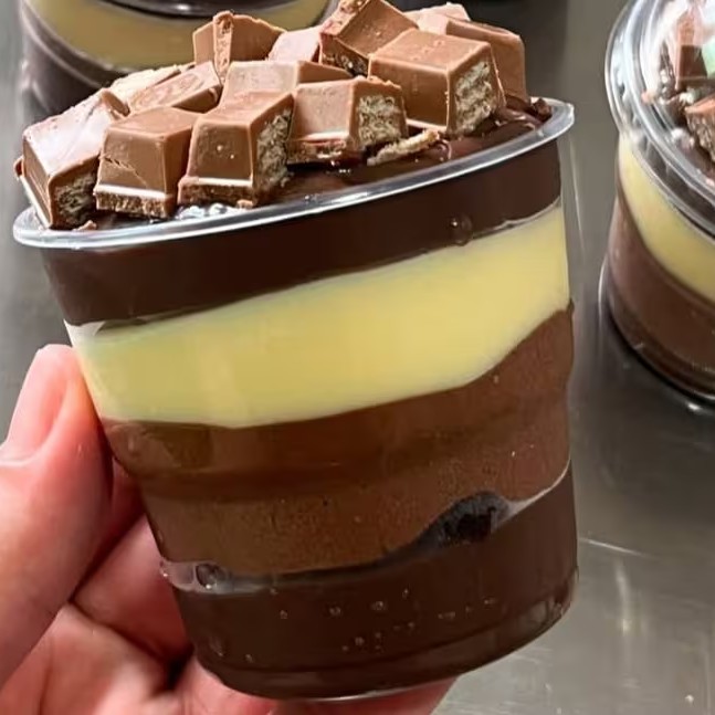 Mousse Kinder, Brownie, Brigadeiro de Ninho, Pedaços de Kinder Bueno, Nutella e finalizado com Brigadeiro 50% cacau. 210g