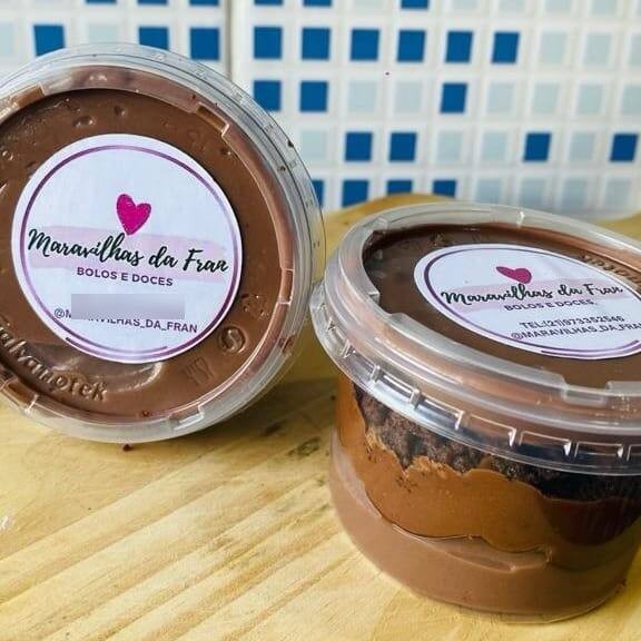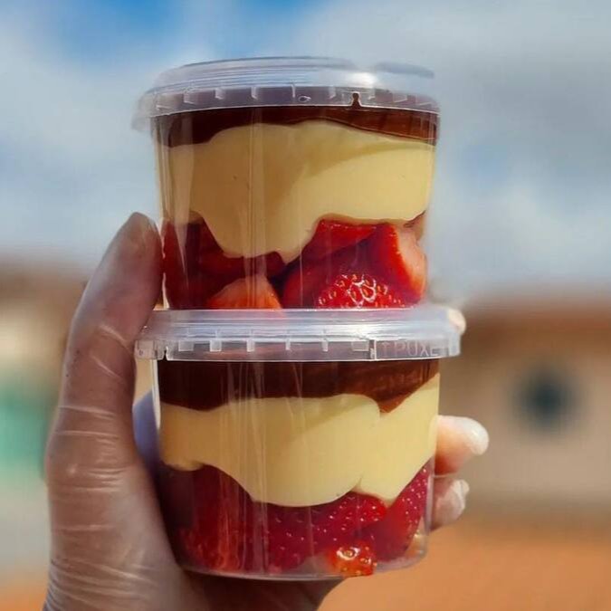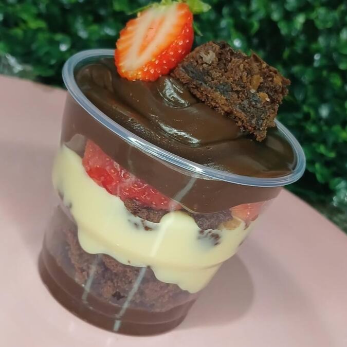 Brigadeiro 50% cacau, Brownie Molhadinho, Brigadeiro de Ninho, Morangos frescos, e finalizado com Brigadeiro.210g
