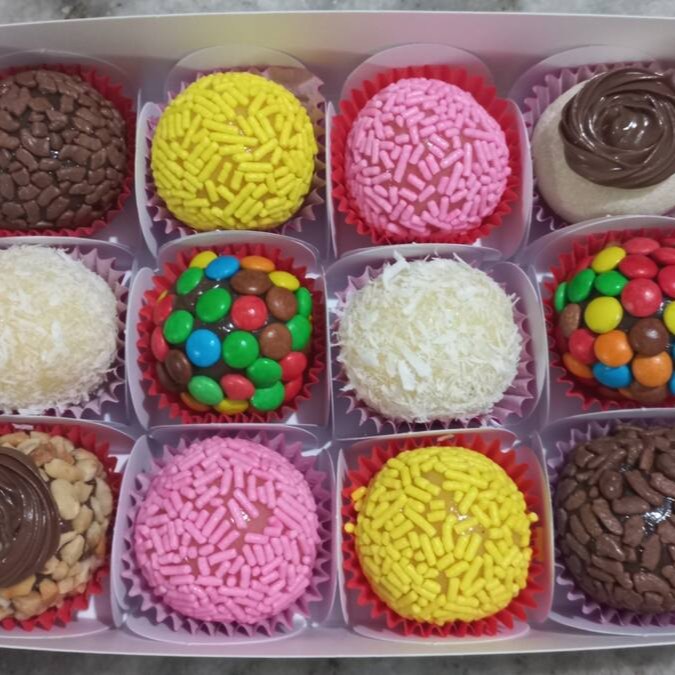 Bandeja composta por 12 unidades,sendo 2 unidades de beijinho,2 brigadeiro,2 morango,2 maracuja,2 Confete,1 Ninho com Nutella,1 Ferrero Rocher