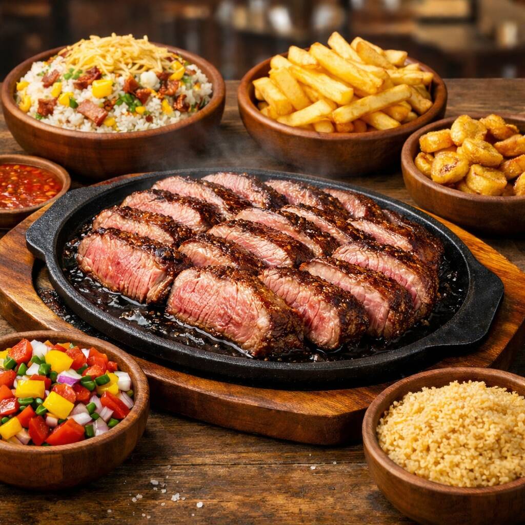 1kg de Picanha - Arroz biro-biro, Batata Frita, Farofa, Vinagrete e Banana Frita.