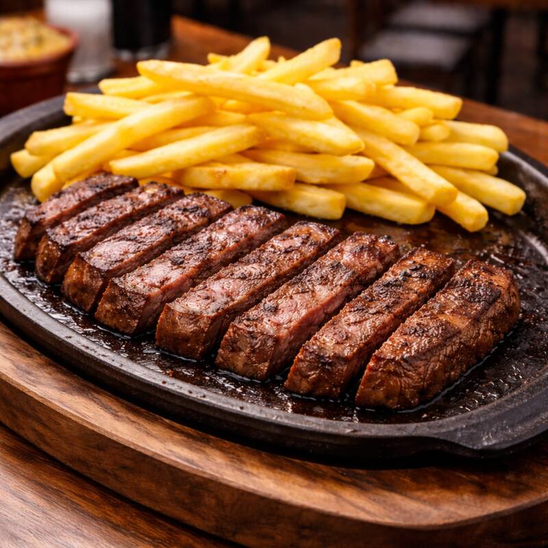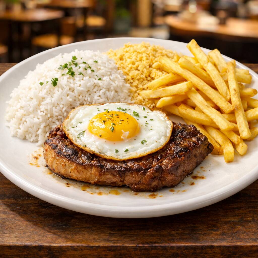 500g de Contra filé - Arroz biro-biro, Batata Frita, Farofa, Vinagrete e Banana Frita.