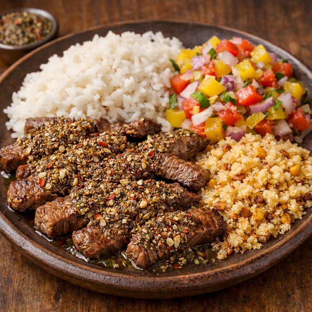 Arroz , farofa , vinagrete , carne vermelha , linguiça de churrasco , medalhao de frango e coração de frango.