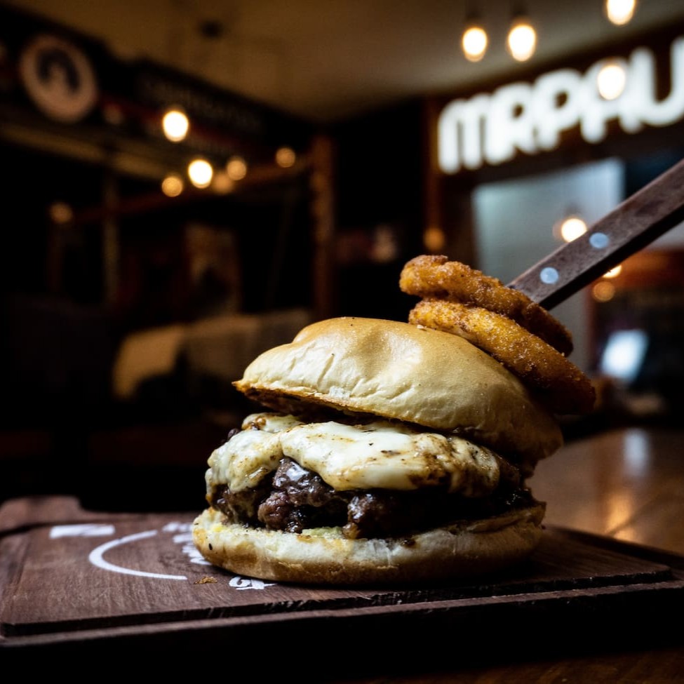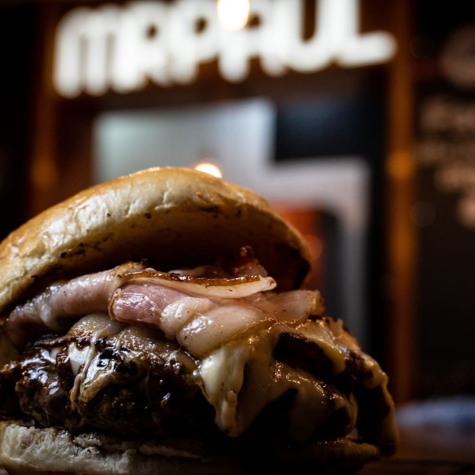 Pão Prime, Blend Angus de 170g, Molho Aioli, Mussarela Derretida no Maçarico, Cebola Crispy e Bacon Crocante.