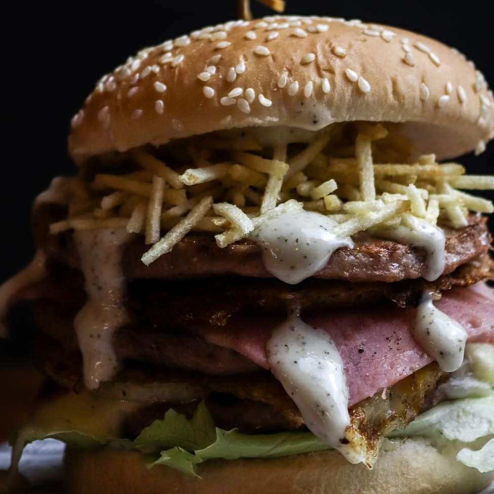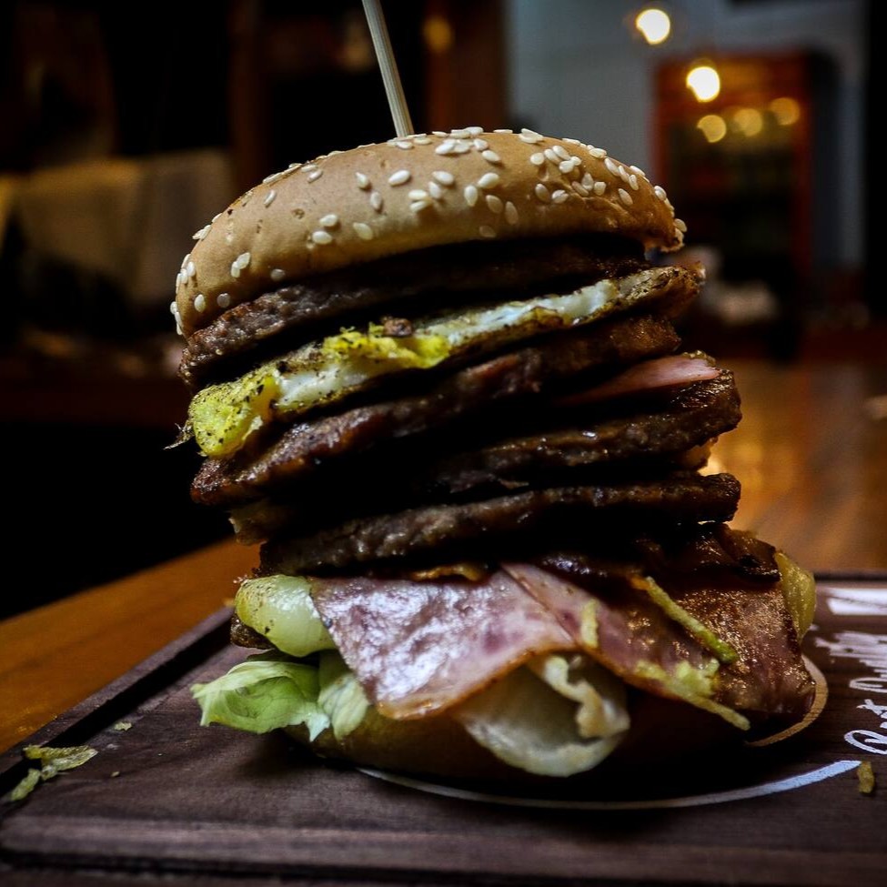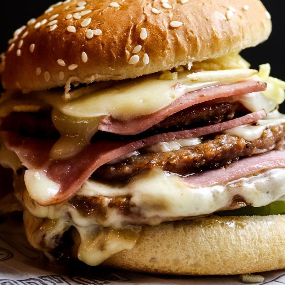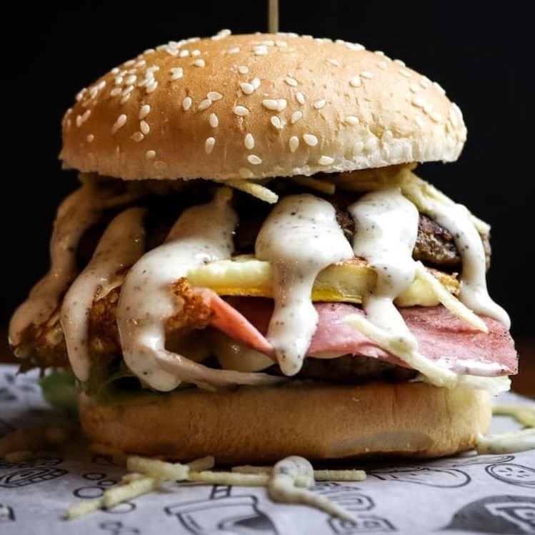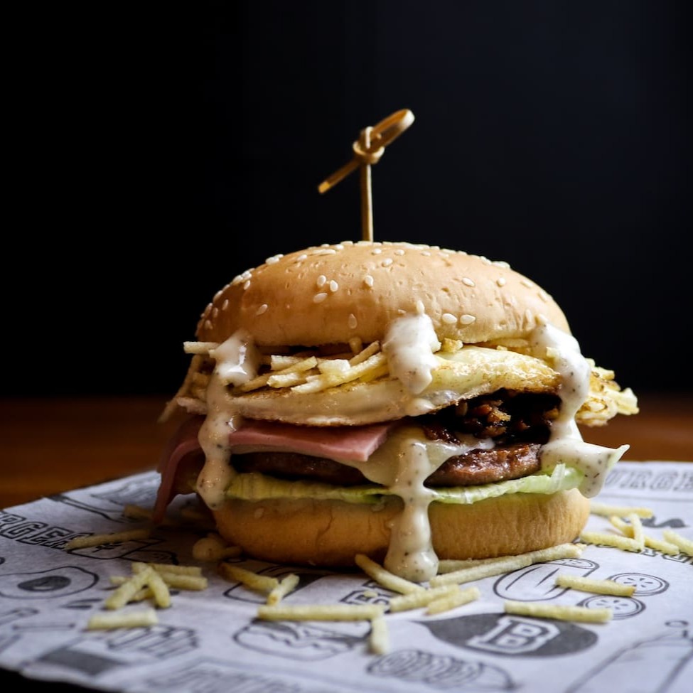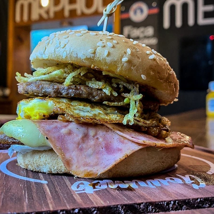 Pão, Dois Burgers de Picanha 90g, Queijo, Presunto, Ovo, Bacon, Salada, Batata Palha e Maionese da Casa.
