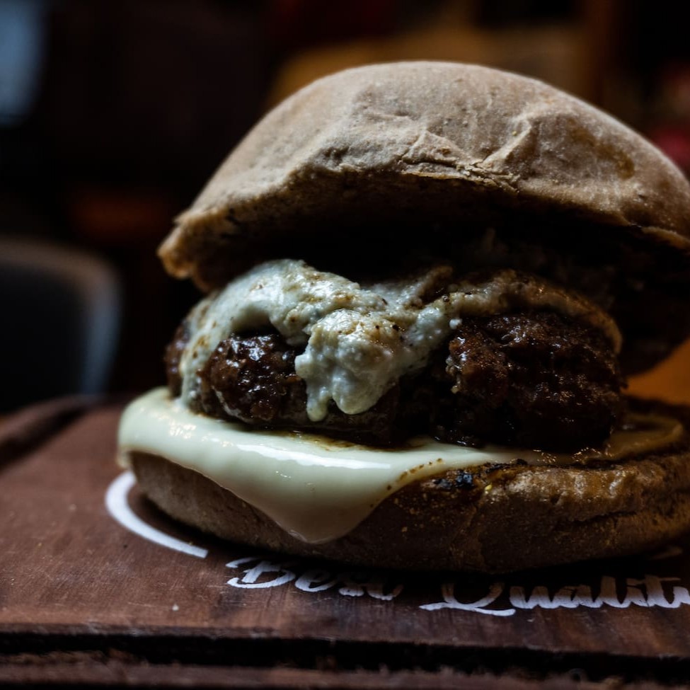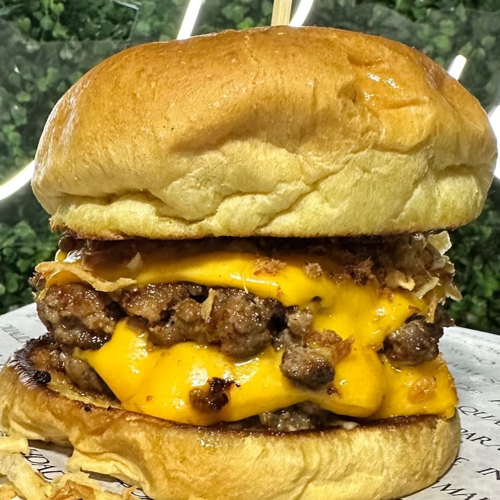 Pão Brioche, Duplo Smash Angus de 80g, Mussarela derretida, e Maionese da Casa.