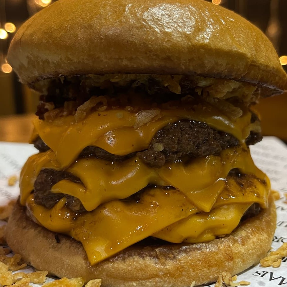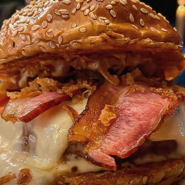 Pão Brioche, 3 Smach Angus de 80g cada, 6 Fatias de American Cheese, Cebola Crispy, Farofa de Bacon e Maionese da Casa.