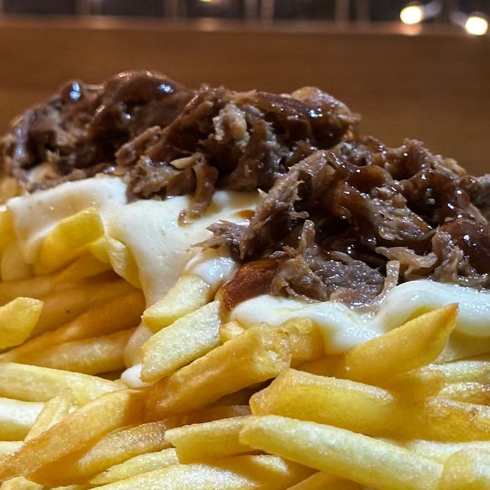 Aproximadamente 250g de Fritas, Mussarela Derretida, uma Deliciosa Costela Desfiada e Molho Barbecue Defumado.