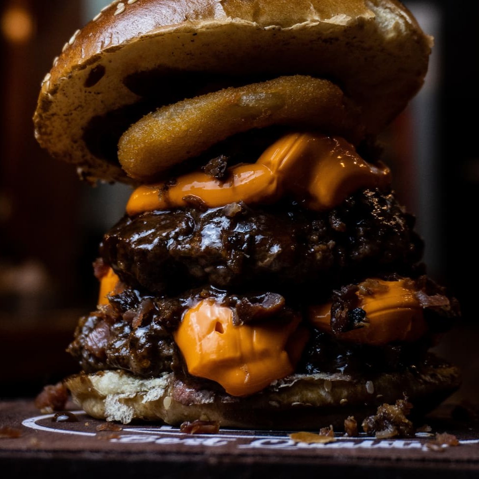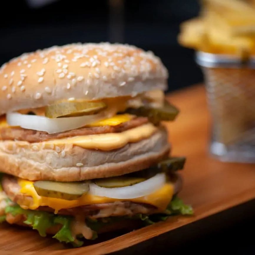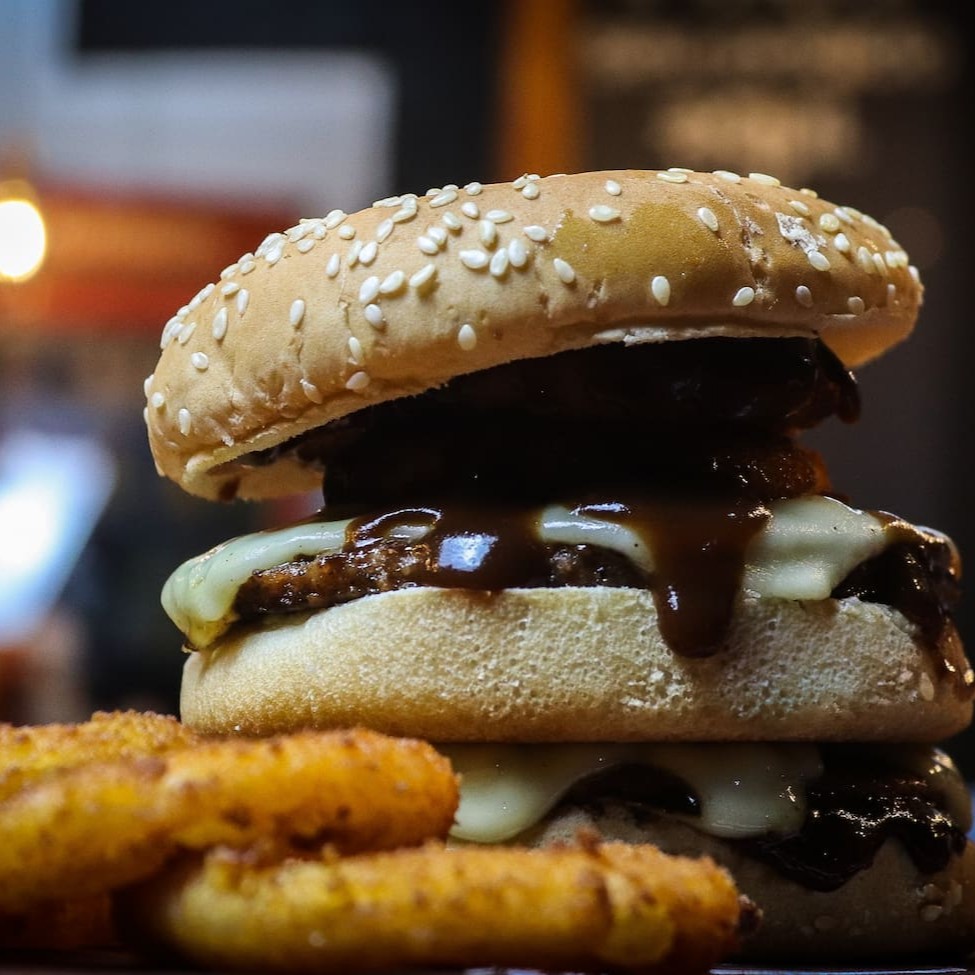 Pão Duplo, Dois Burguers de 56g Com queijo, Molho Barbecue e Anéis de Cebola Empanados.