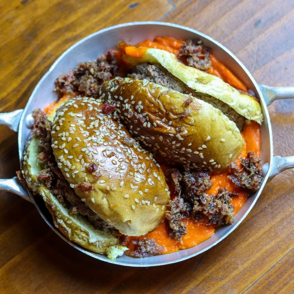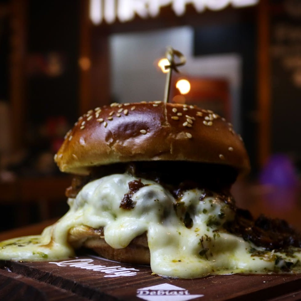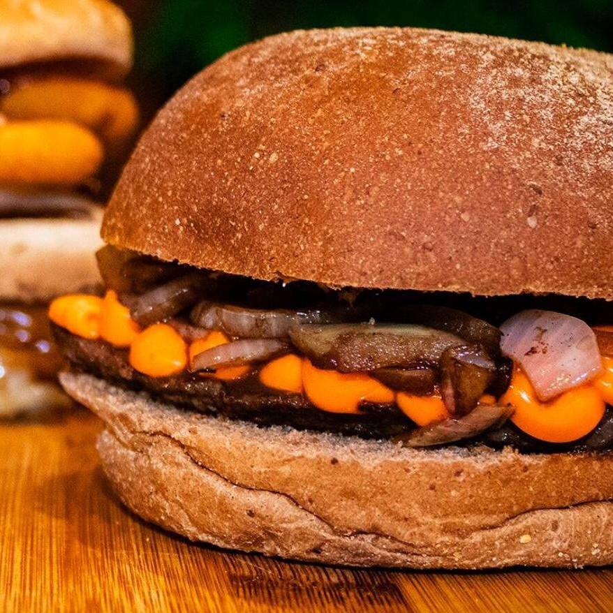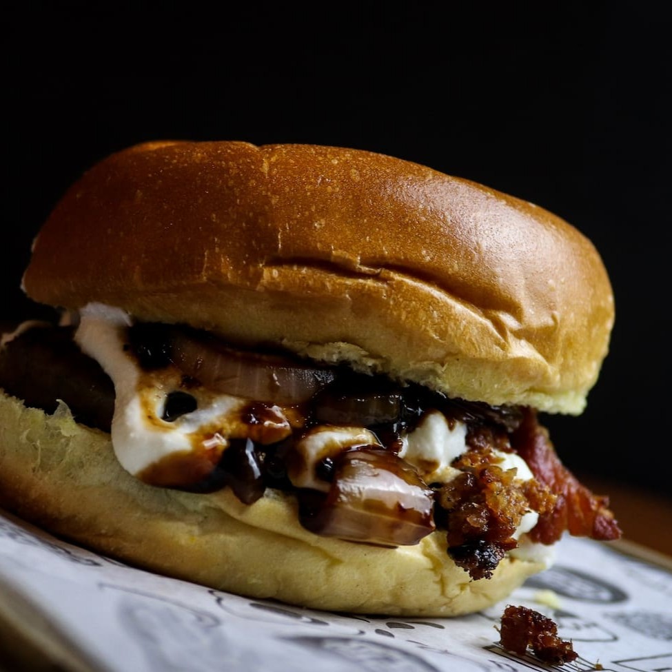 Pão Brioche, Burger de Picanha 90g, Cream Cheese, Cebola Caramelizada ao Tarê e Bacon.