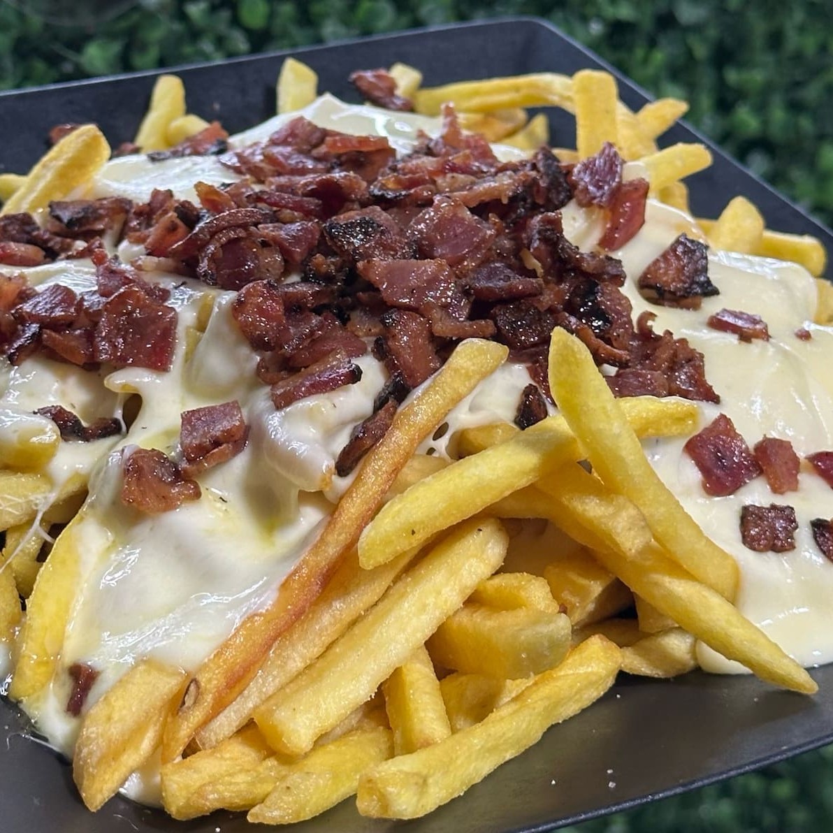 Aproximadamente 250g de Fritas, Cheddar Cremoso e Bacon.