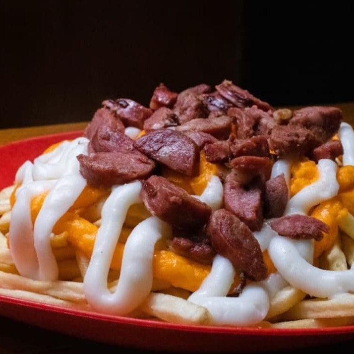 Aproximadamente 250g de Fritas, Cheddar, Requeijão Cremoso e Calabresa.