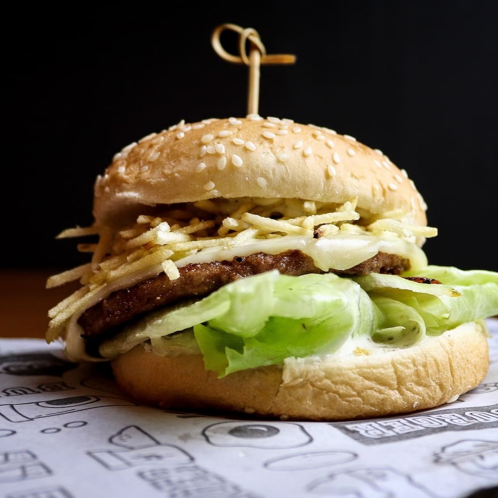 Pão, Burger 56g, Queijo, Salada, Palha e Maionese da Casa.