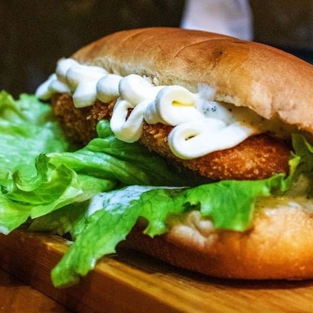 Filé de Peito de Frango Empanado na Casa, Coberto por Cream Cheese, Alface, Tomate, Cebola, Picles e Maionese da Casa.