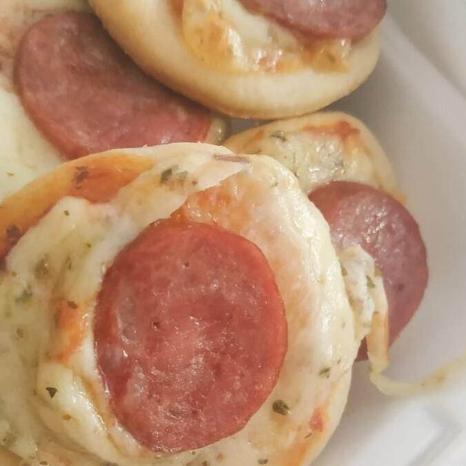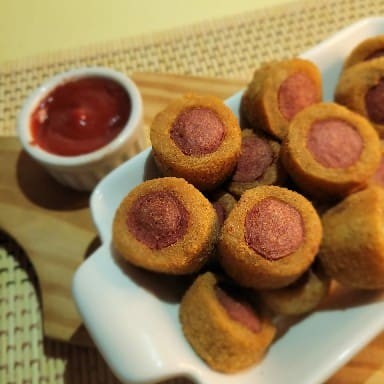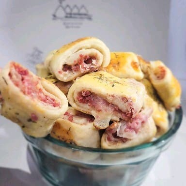 Mini joelho assado de calabresa com muçarela. Porção com 10 unidades.
