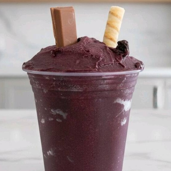 Açaí natural de 500ml, com camadas alternadas com sorvete. Acompanha leite em pó, Kit Kat e canudinho de biscoito.