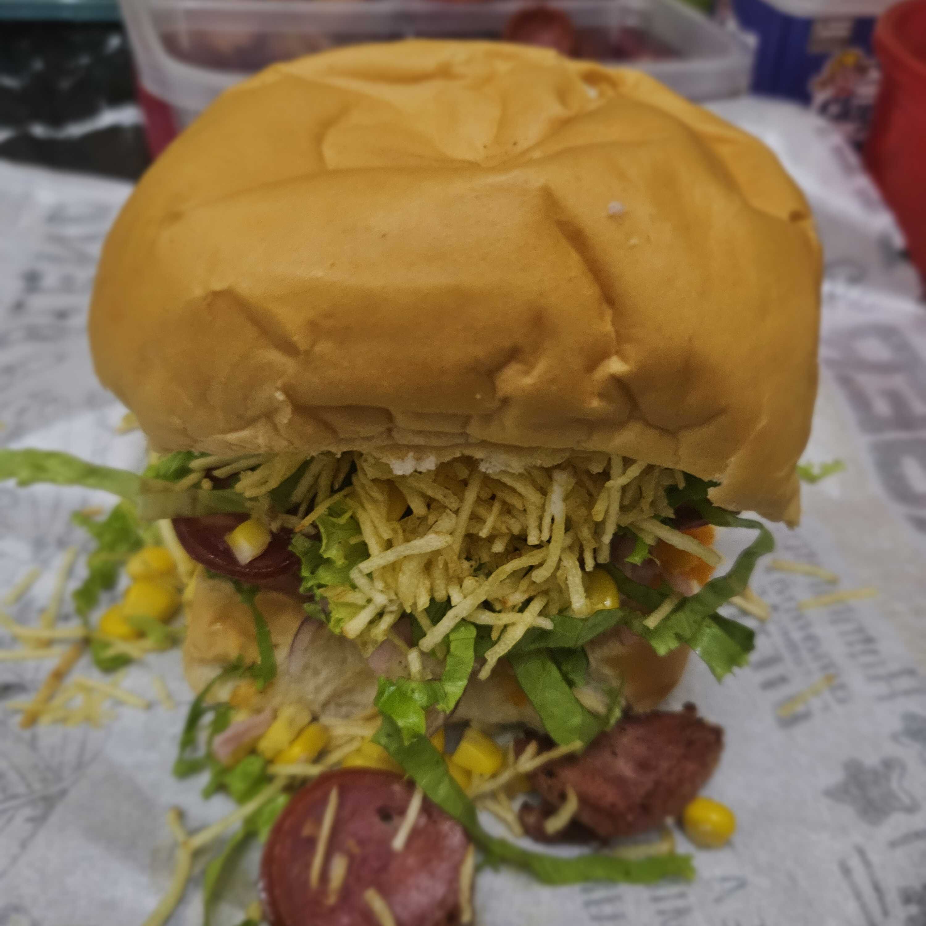 Pão, hambúrguer, queijo, bacon, calabresa, presunto, cheddar, ovo, alface, tomate, batata palha, milho e cebola roxa.