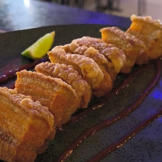 Barriga de porco glaciada no molho oriental. Acompanhada de fritas.