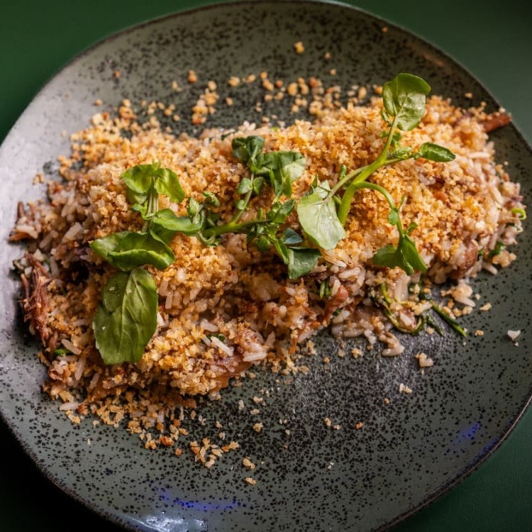 Costela Angus + arroz + farofa panko e alho assado. Energia para exploradores.