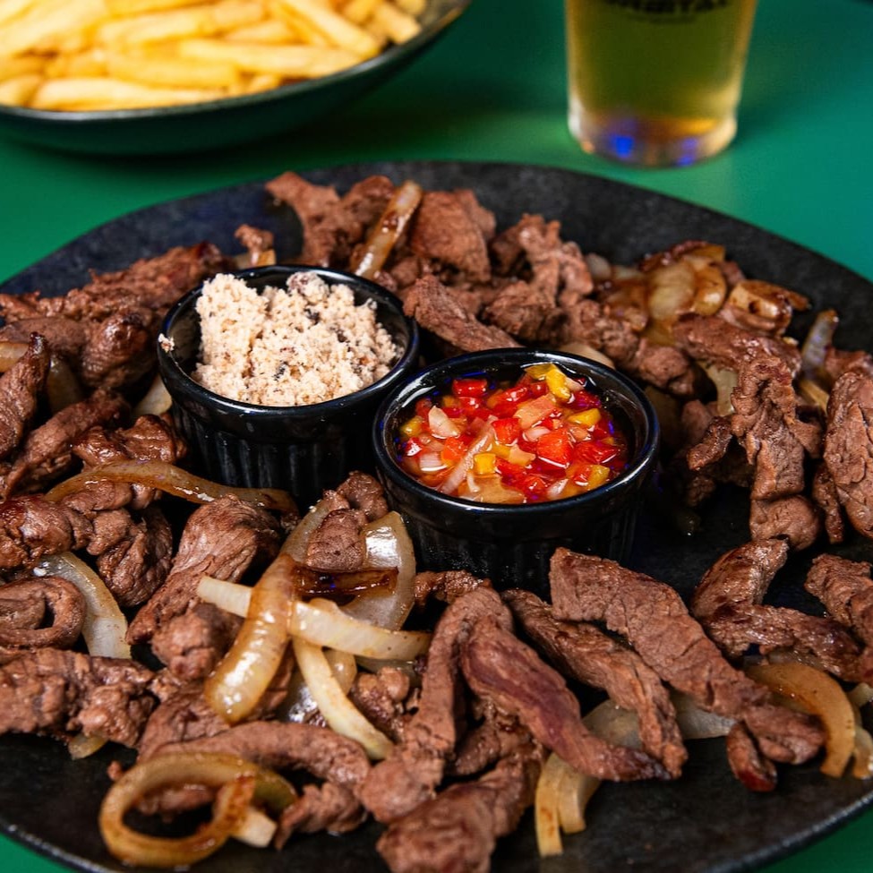 400g de iscas de carne bovina, batata frita, farofa e molho vinagrete.