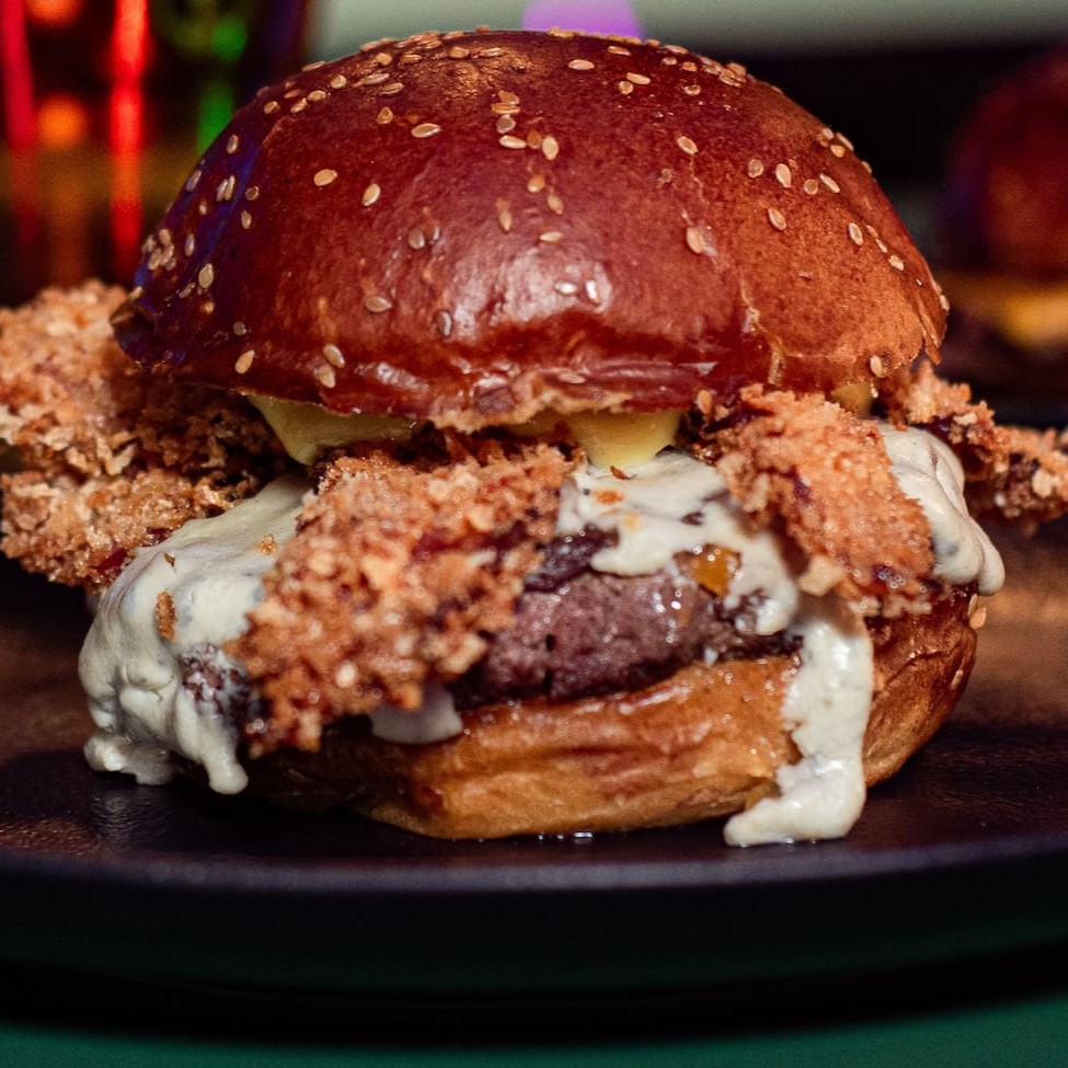 Blend de 180gr, fatias crocante de bacon empanado e molho gorgonzola e geleia de damasco