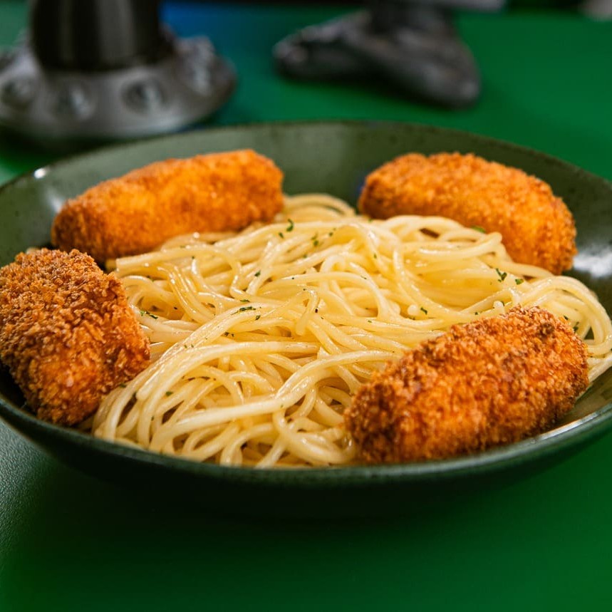 Nuggets artesanal de frango com espaguete na manteiga.