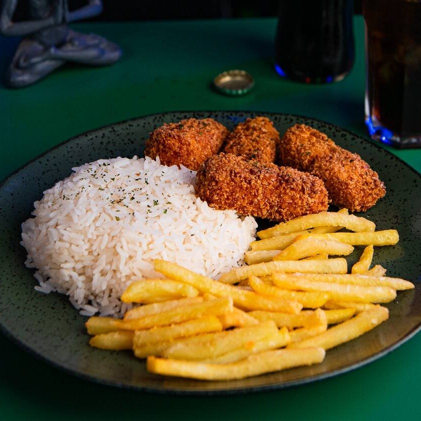 Nuggets artesanal de frango com arroz, feijão e fritas.