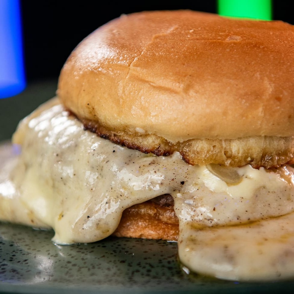 Blend 180g, queijo spicy, maionese dijon e glace de cebola no conhaque.